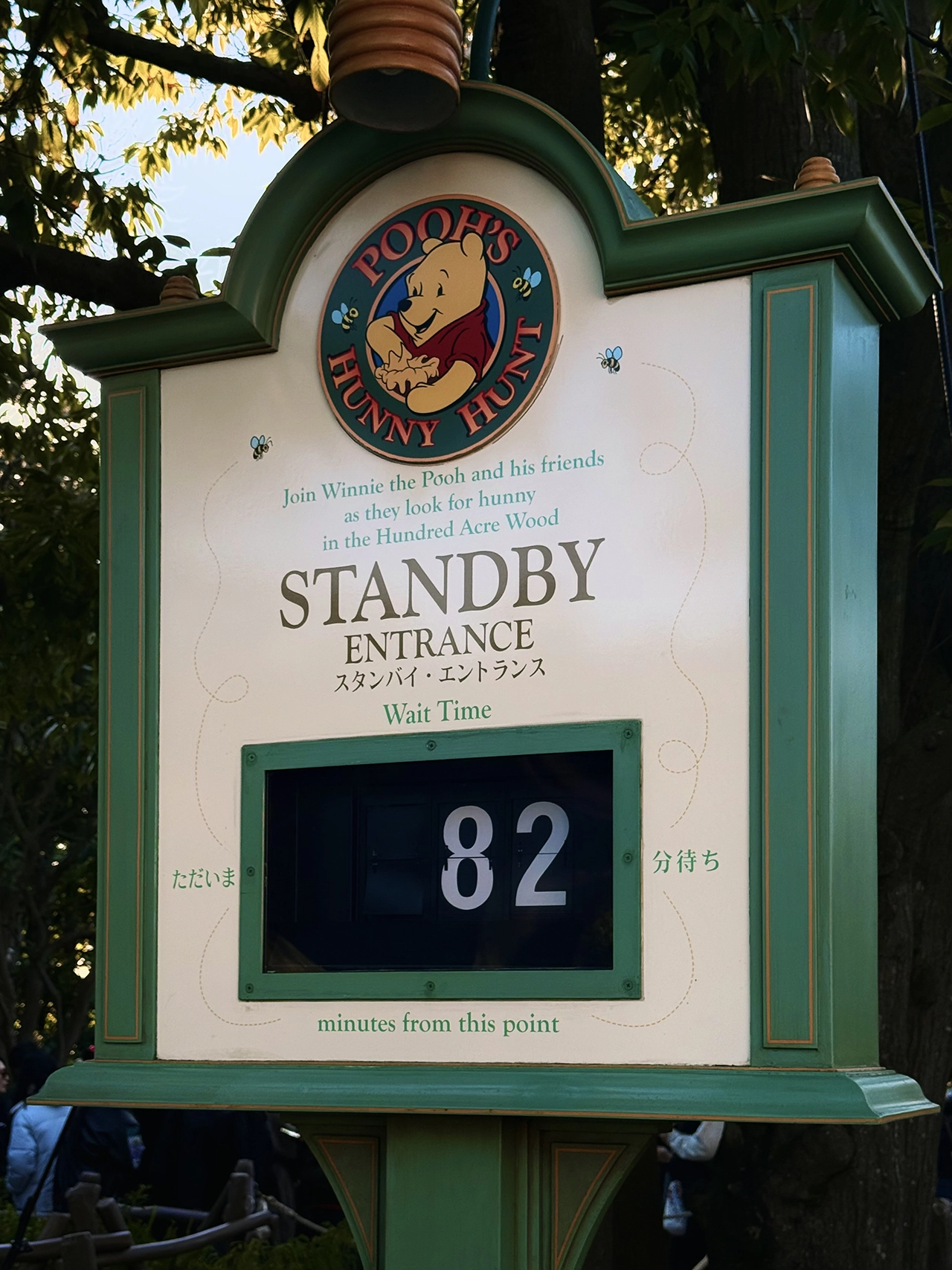 I noticed Pooh’s Hunny Hunt had an 82-minute wait time, so I went over to snap a photo. The Cast Member was so ready. She knew exactly what I was walking over to do, stepped out of the way, and threw her hands over to point to the time that read 82 minutes, saying 「はに!」which is a short version of saying “eight two” that sounds like “honey.” I did not wait in that line.