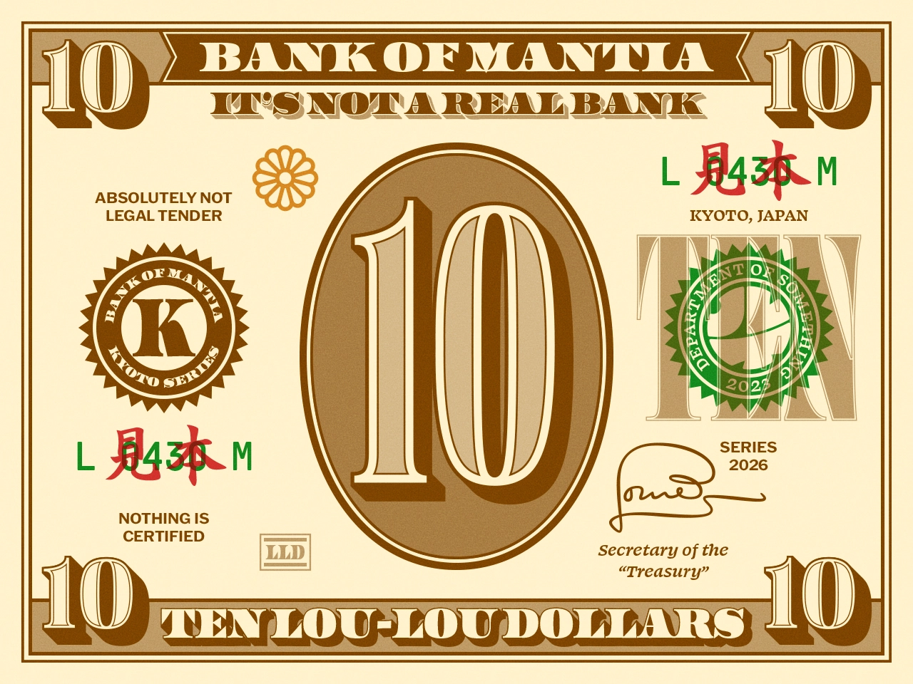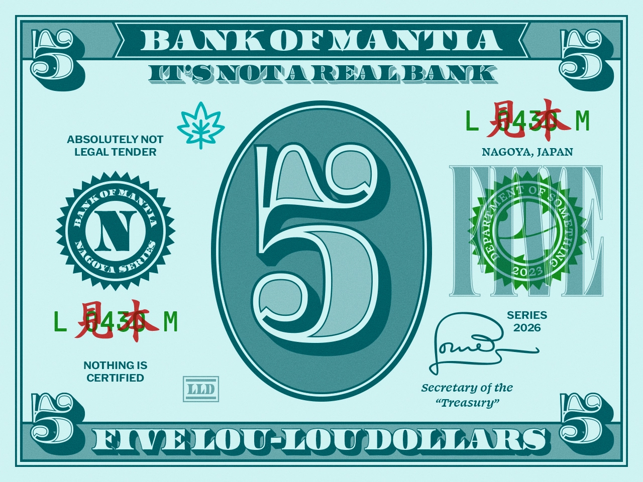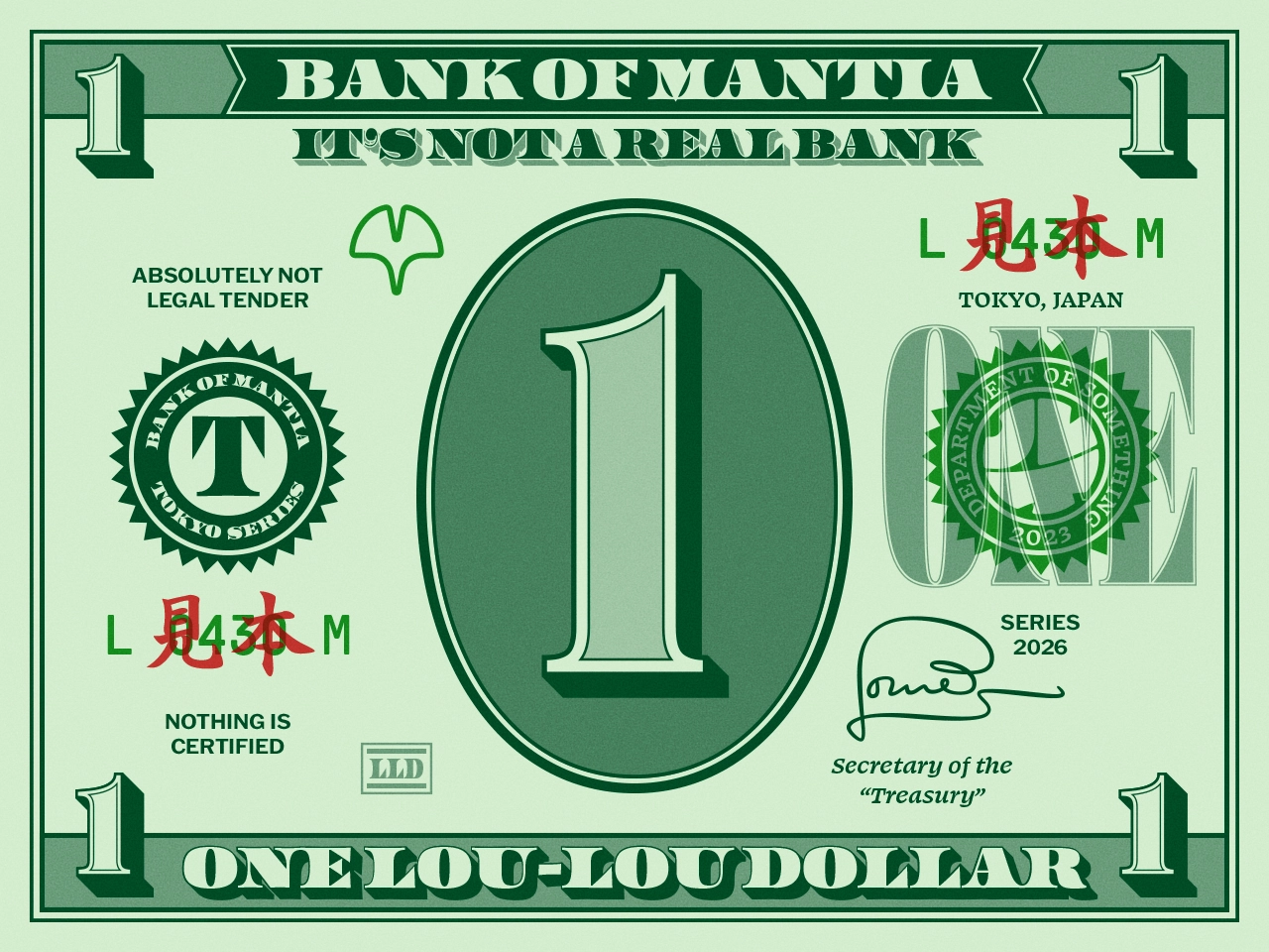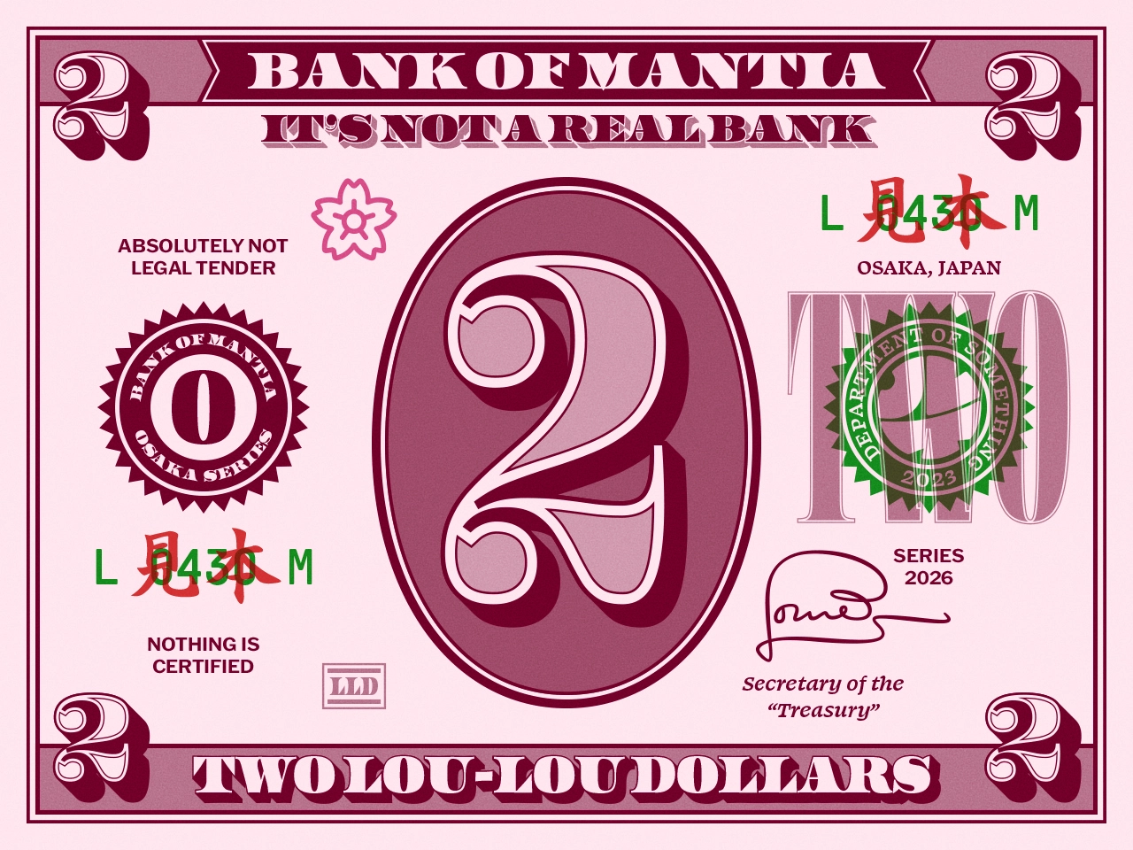 I made a 1 Dollar bill, with these little details that only matter to me, bits of nonsense that exist only to satisfy the aesthetic. But I couldn’t stop at One. So I made a Two. Please note while the One has a ginkgo leaf and is from the Tokyo series, the Two has a sakura and is from the Osaka series. Because.